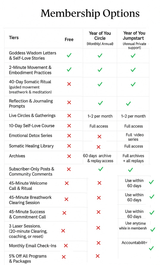 Each tier is designed to meet you exactly where you are. Whether you’re ready to explore, deepen, or fully devote to The Year of You, every level helps you reconnect with your body, calm your mind, and remember your worth.